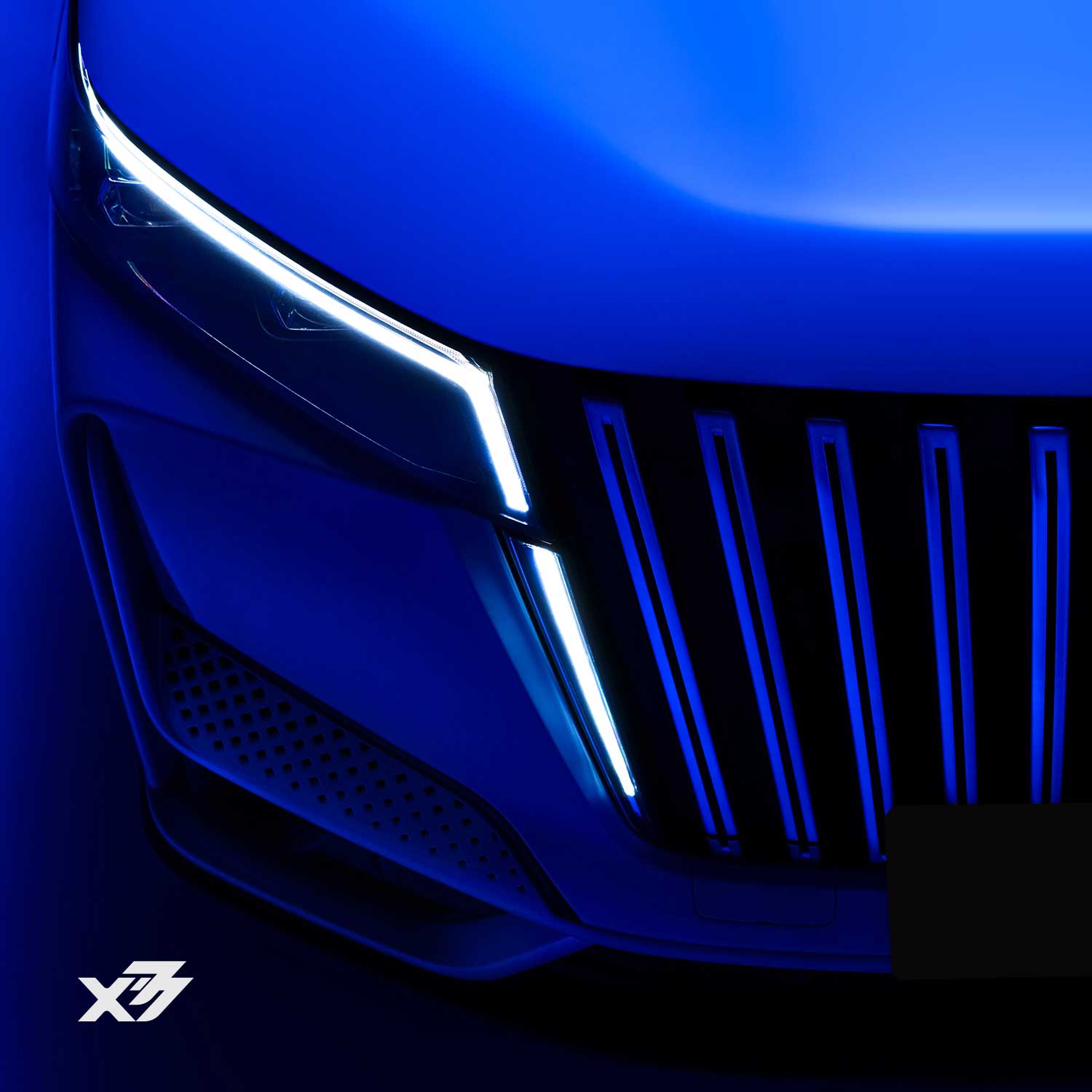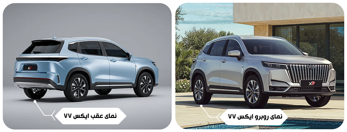ایکس 77 جلوپنجره بزرگ با خطوط عمودی کرومی با طراحی آبشاری دارد که به سمت چراغها کشیده شده است. چراغهای LED باریک به همراه دیلایت (چراغ روز) با طراحی L شکل. همچنین شکست و زاویهگیریهای تیز و خطوط حجمی در طراحی کاپوت و جلو بدنه برای جلوه اسپرتتر دیده میشود.